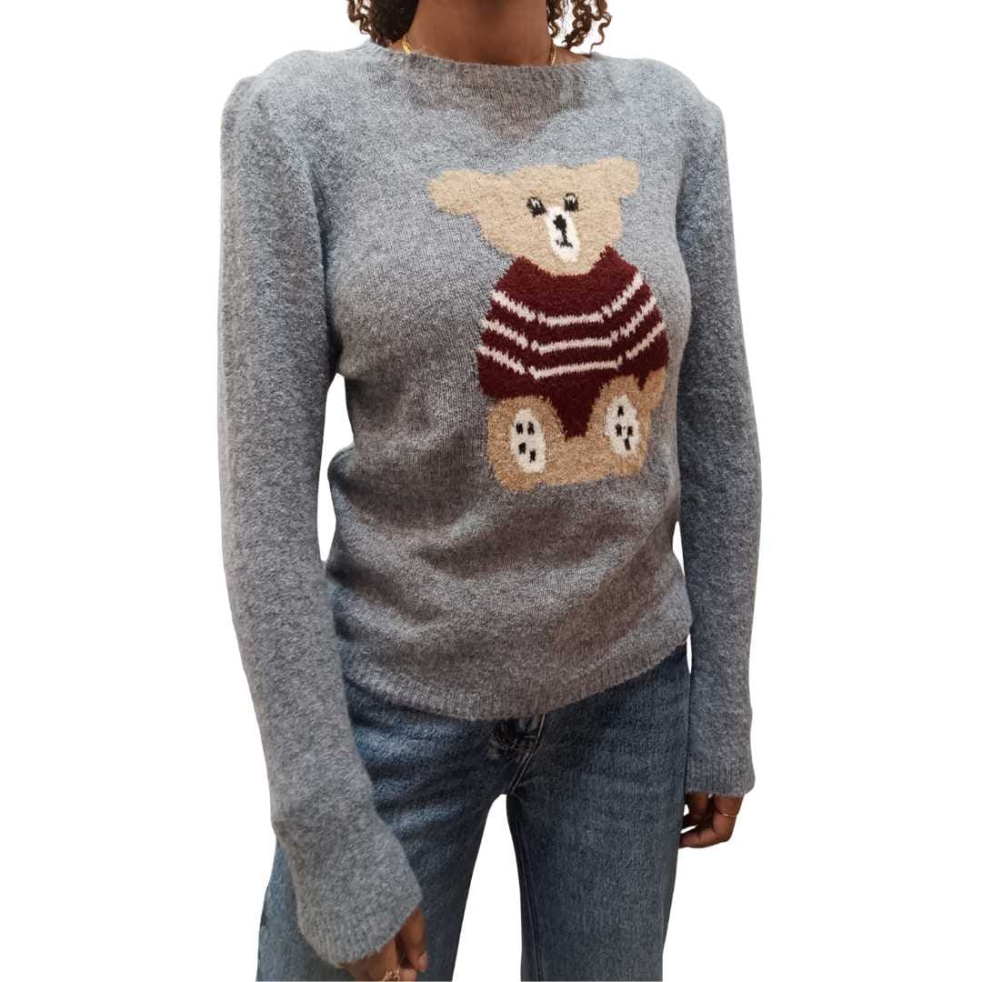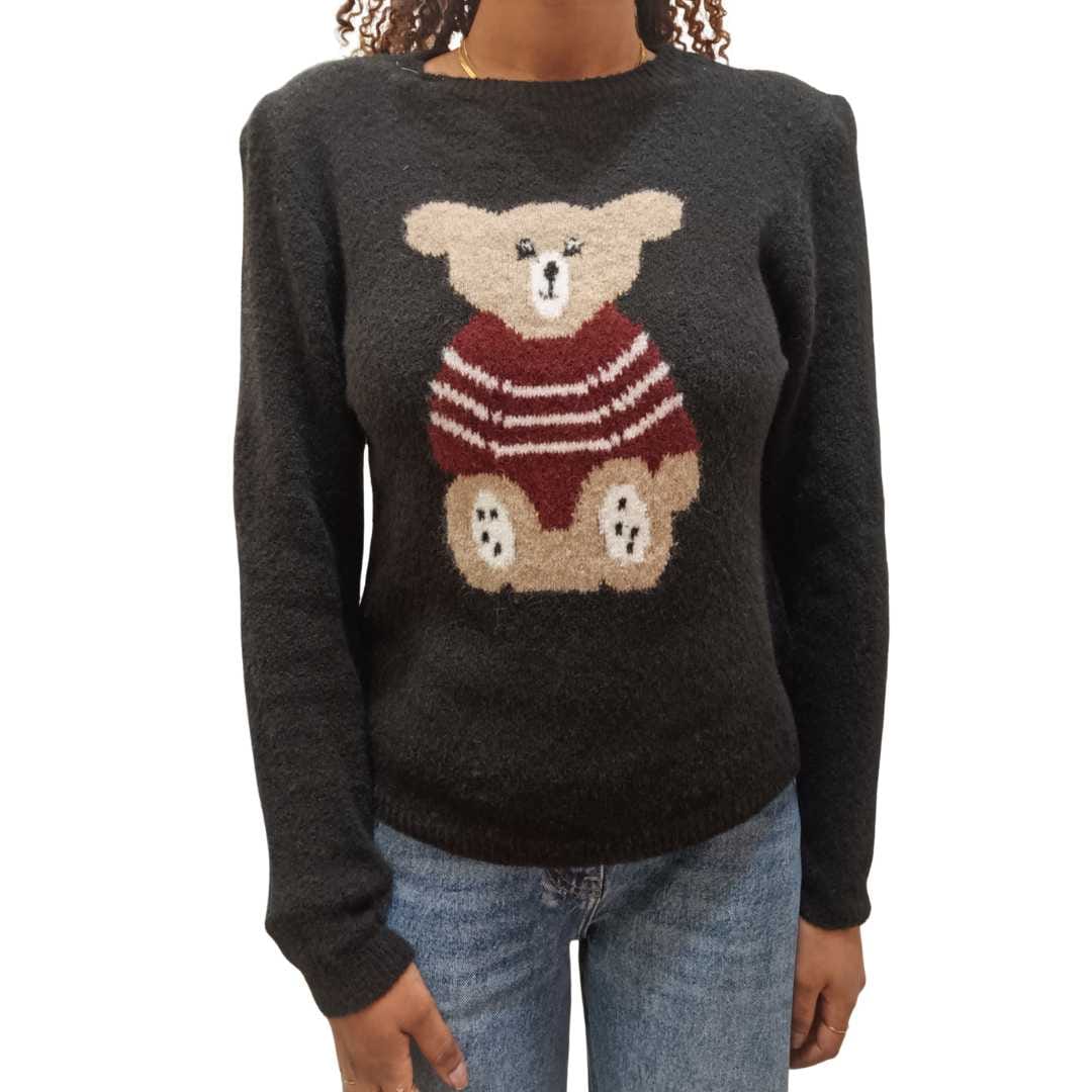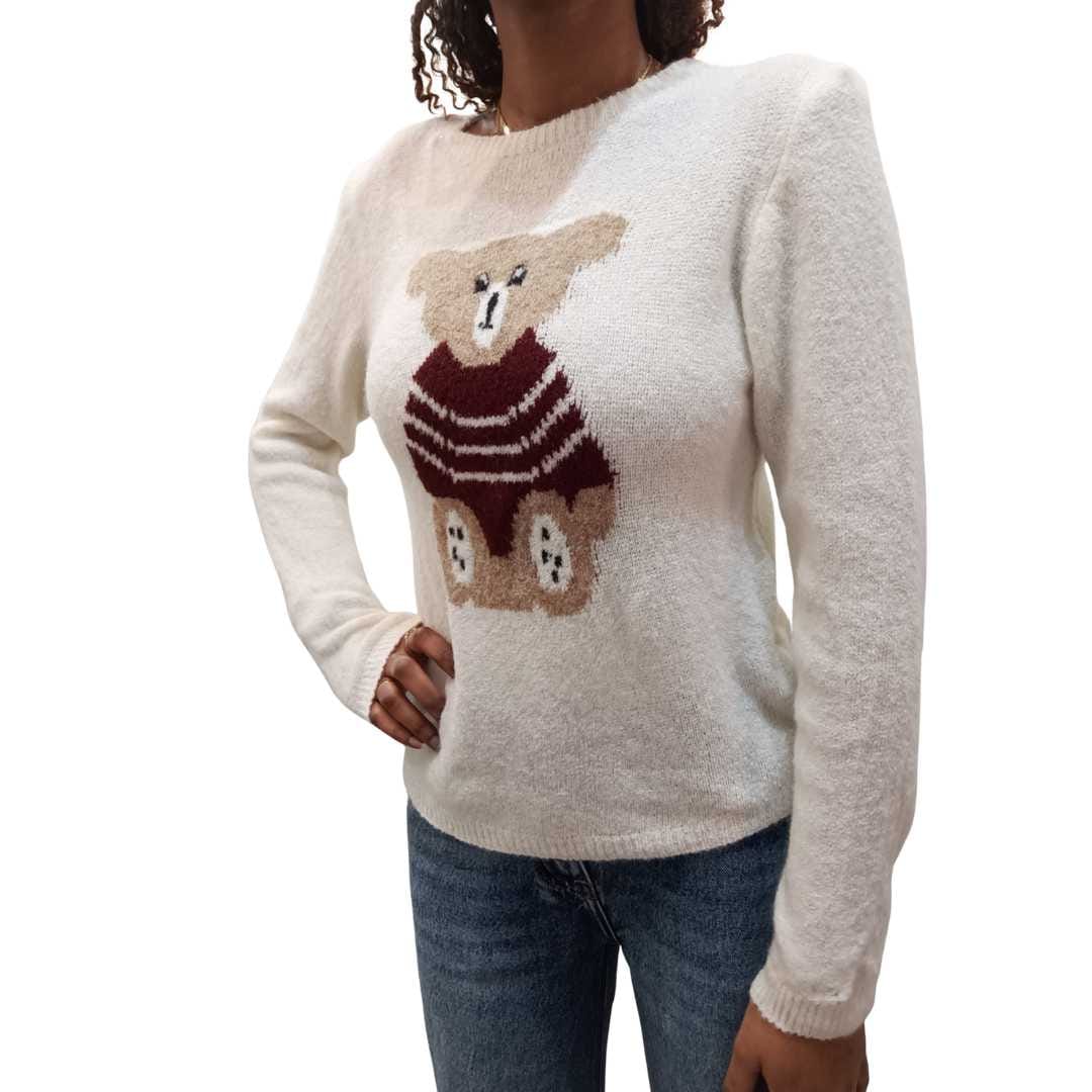Maglione da donna dal design dolce e moderno, caratterizzato da fantasia a righe e applicazione con orsetto, perfetto per aggiungere un tocco giocoso e trendy ai look quotidiani.