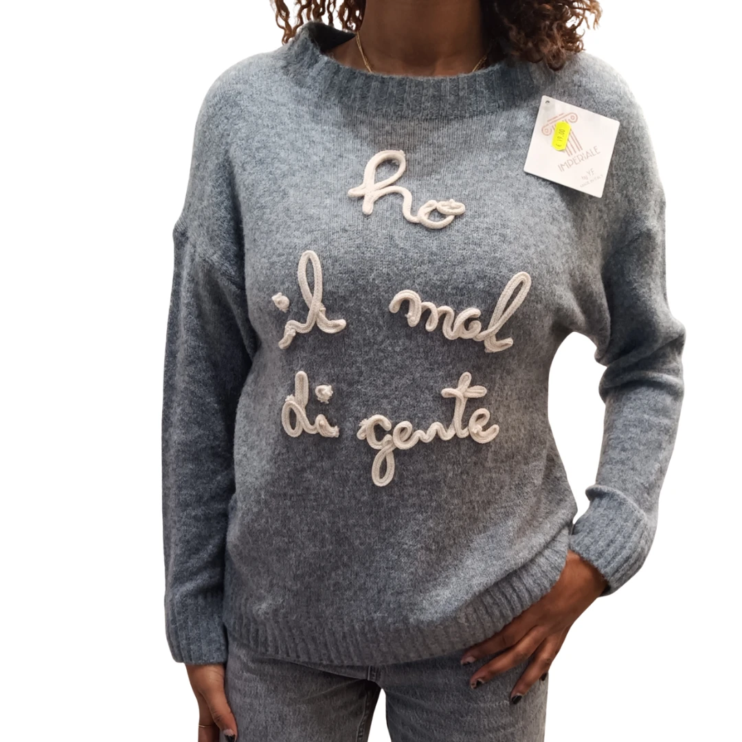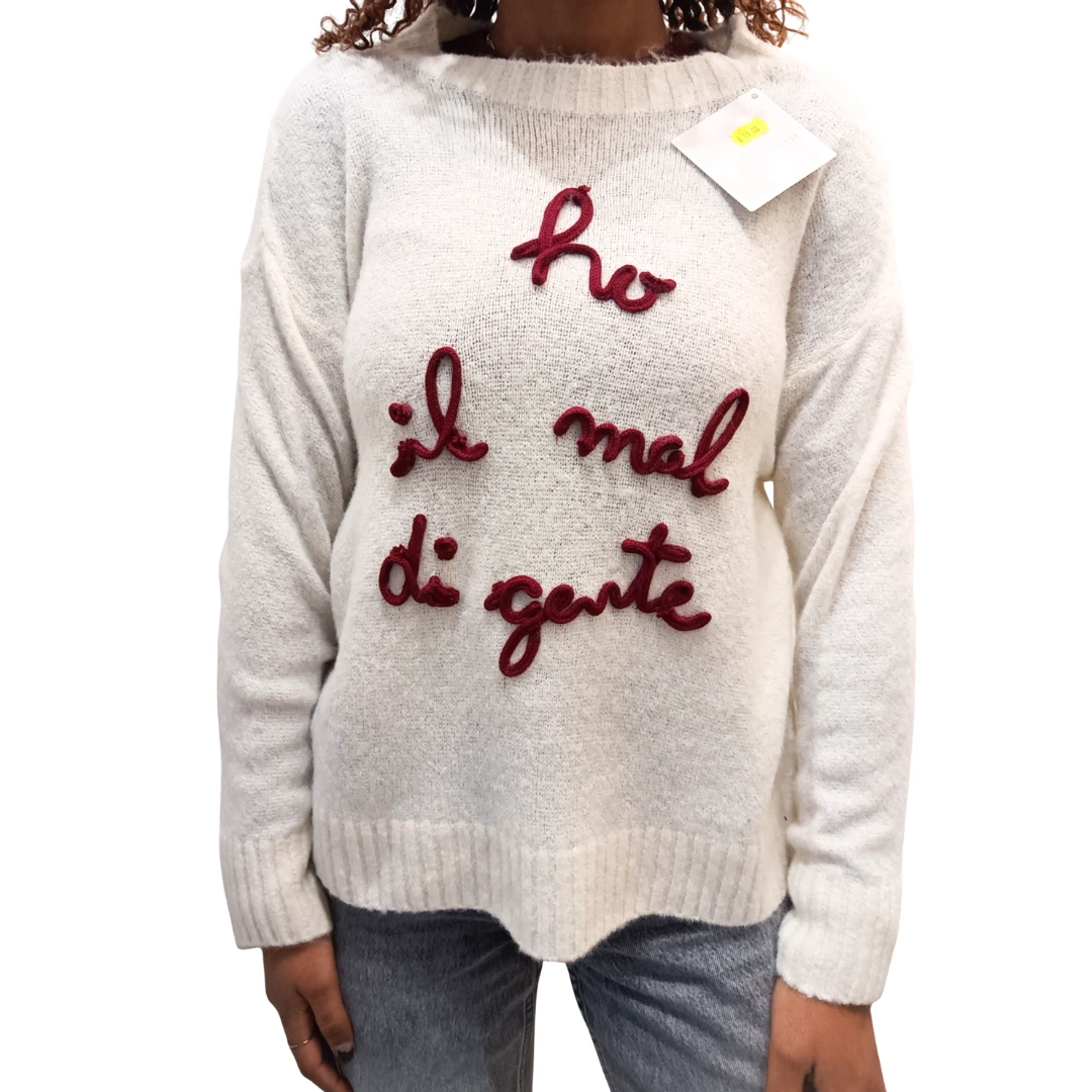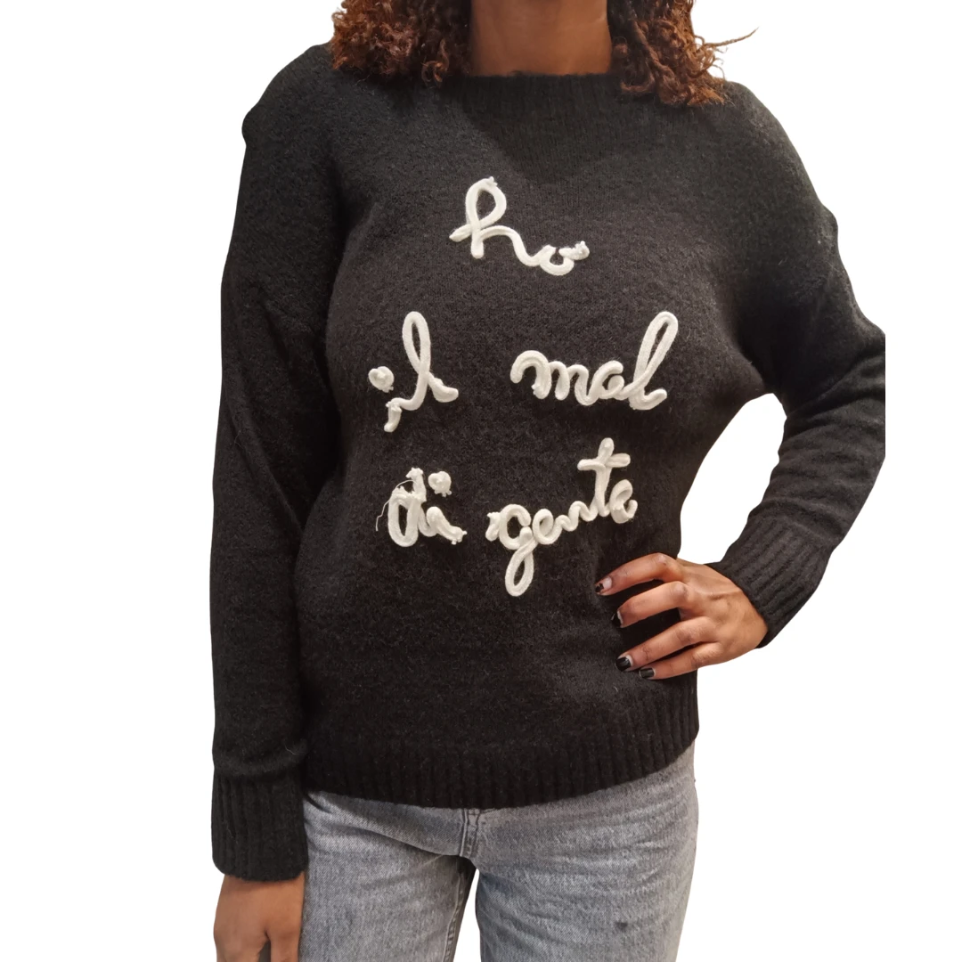 Maglione da donna con scritta “Ho mal di gente”, perfetto per chi ama uno stile ironico e contemporaneo. La taglia unica, con vestibilità dalla 40 alla 46, offre una linea comoda e rilassata, ideale per l’uso quotidiano.