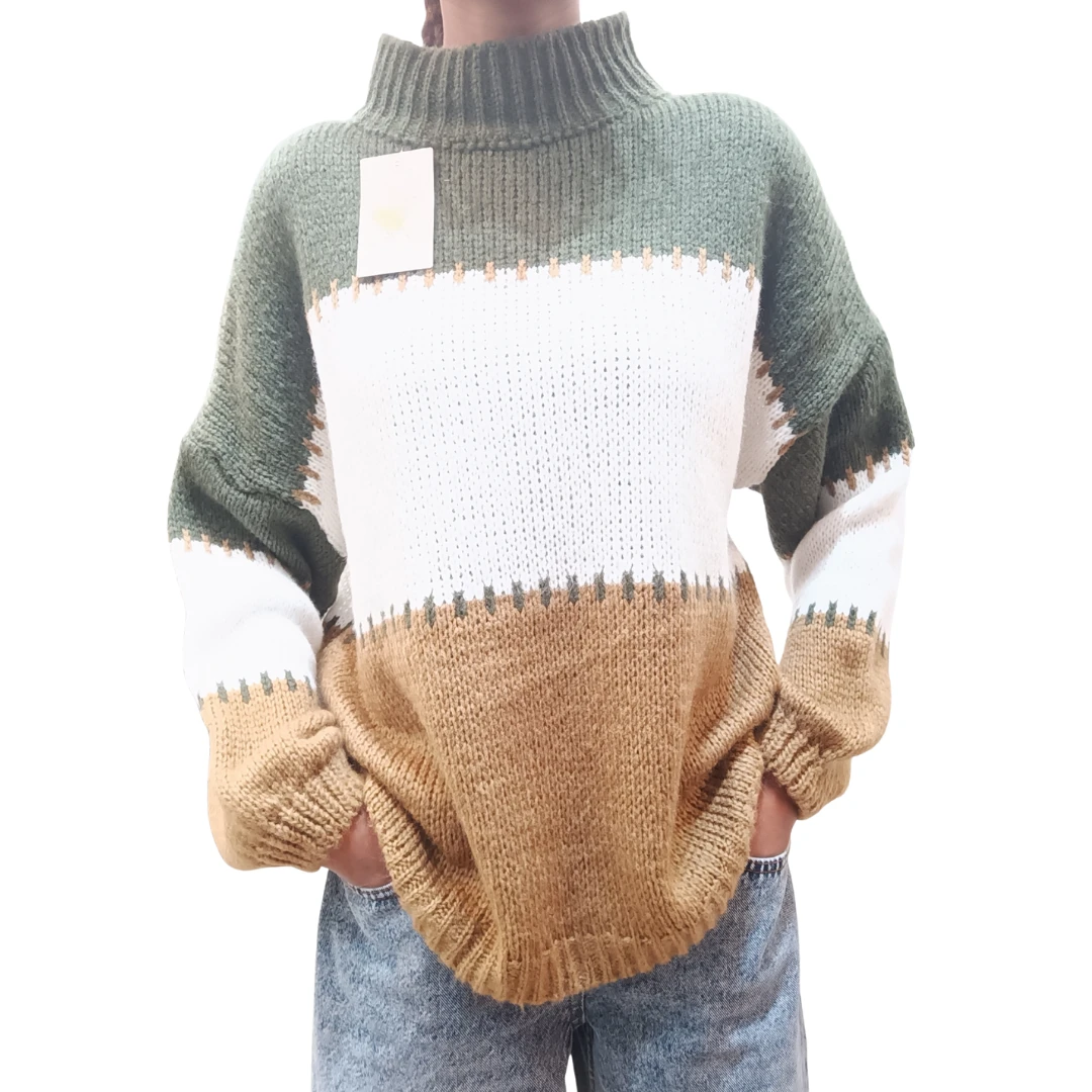 Il maglione con collo alto e vestibilità morbida è un capo versatile e confortevole, ideale per le giornate più fredde. La linea morbida garantisce libertà di movimento e comfort durante tutta la giornata. Realizzato in 79% acrilico e 21% poliammide, è caldo, resistente e facile da abbinare a jeans, pantaloni o gonne. Il collo alto aggiunge un tocco elegante e protegge dal freddo, rendendo il maglione perfetto per look casual o smart-casual.