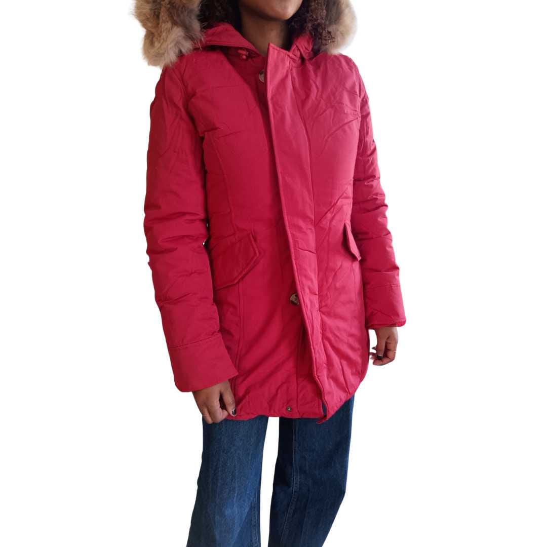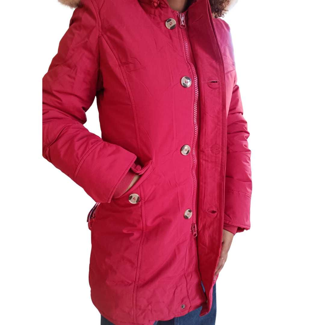 Giacca da donna imbottita modello parka nel delicato colore rosso, ideale per affrontare la stagione fredda con stile e praticità. Il design è arricchito da cappuccio con pelo removibile, perfetto per adattare il capo a diverse esigenze e occasioni.