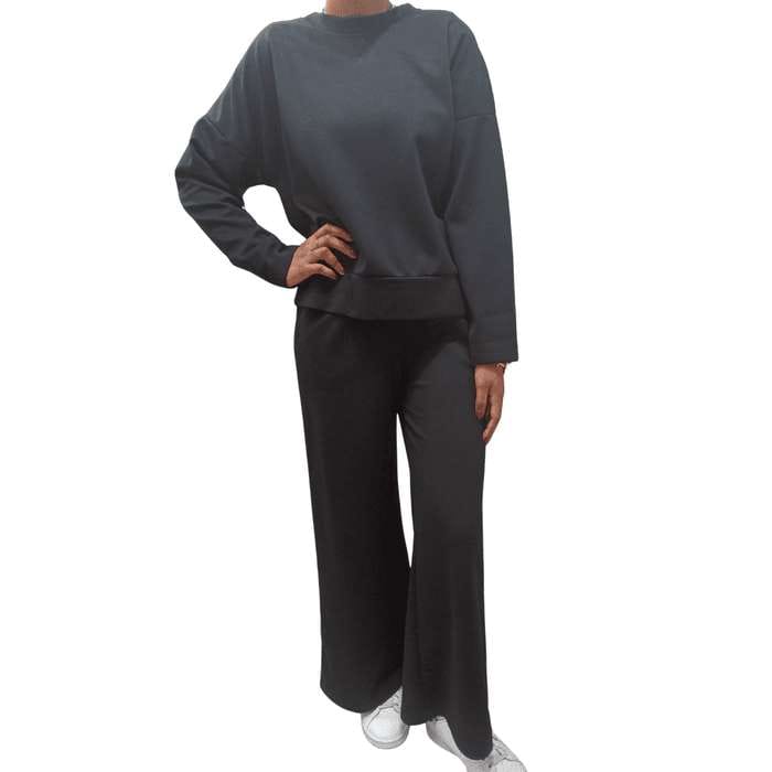 Il design a girocollo dona un tocco essenziale ed elegante, mentre il pantalone palazzo slancia la figura e garantisce una vestibilità morbida e fluida.